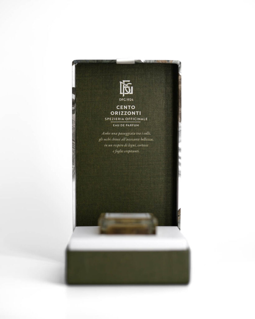 Passeggiando tra le colline intorno ad Asolo, su viottoli e stradine sterrate, tra essenze legnose, respirando l’aria carica di odori trasportati dal vento, è nata l’ispirazione per il profumo che porta il nome Cento Orizzonti: legni e ambre sono il tema principale da cui traspira un’aromaticità fatta di bacche di ginepro e anice stellato